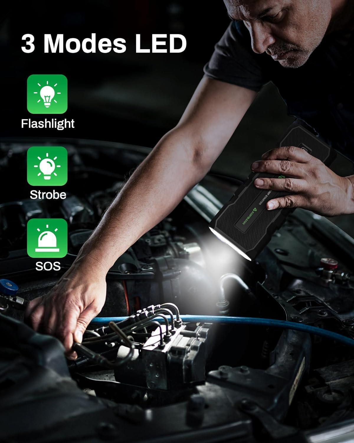 【LED Light with Multiple Modes】300 Lumens LED Light: This car jumper starter portable comes with a powerful 300-lumen LED light that offers three variable lighting modes: steady, strobe, and SOS. Whether you need to change a tire at night or signal for help in an emergency, this jump box for car battery has you covered with its versatile lighting options.