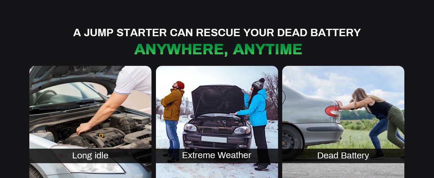 【Convenient and Durable】EVA Carry Case: This portable jump starter for car comes with a durable EVA carry case, making it easy to store and transport. The compact design ensures that it won't take up too much space in your trunk, while the sturdy case protects it from damage during transit.
